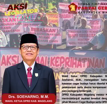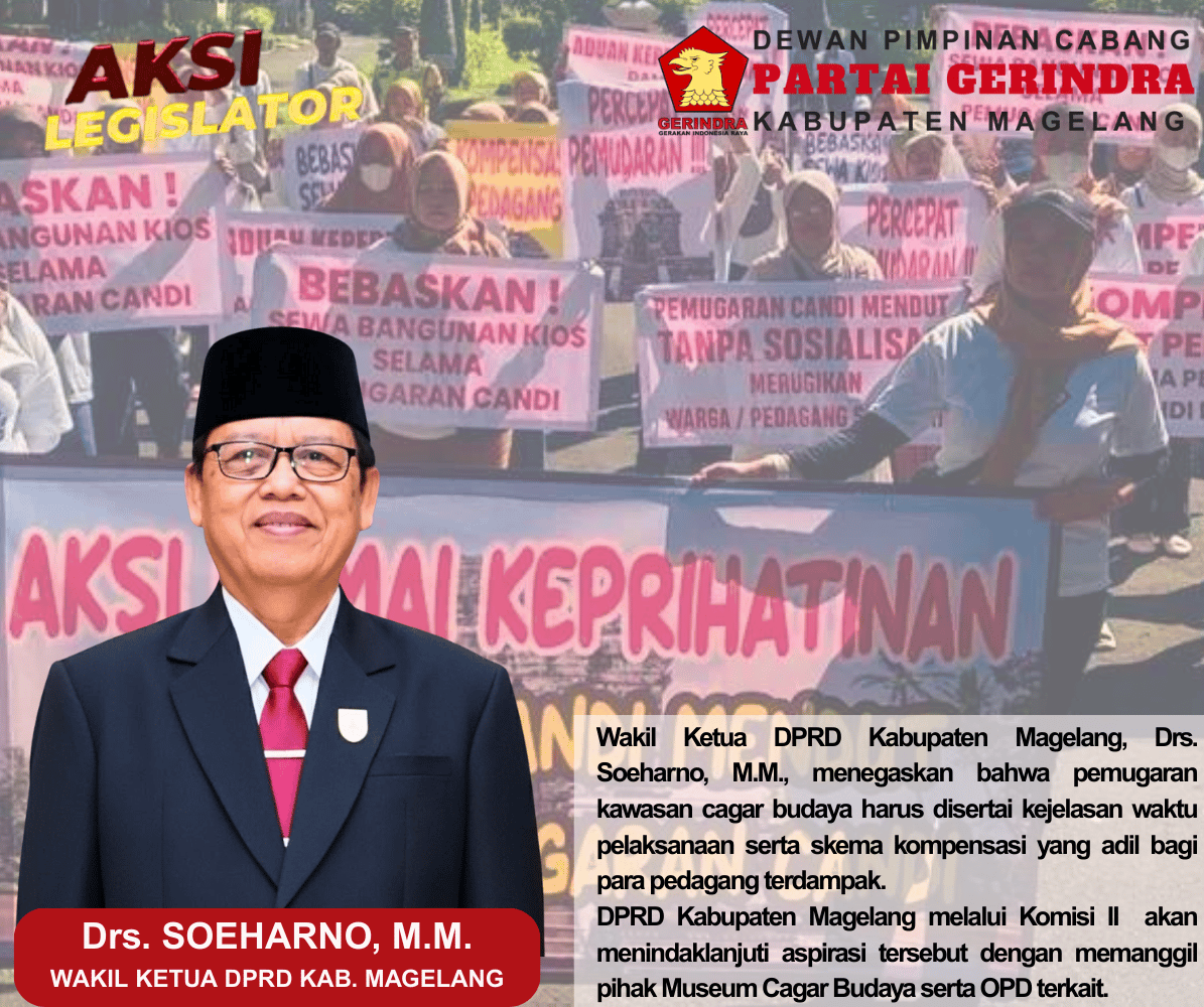 Wakil Ketua DPRD Kabupaten Magelang Drs. Soeharno, M.M. menegaskan perlunya kompensasi dan kepastian kebijakan bagi pedagang terdampak pemugaran Candi Mendut oleh Museum Cagar Budaya demi keadilan sosial.